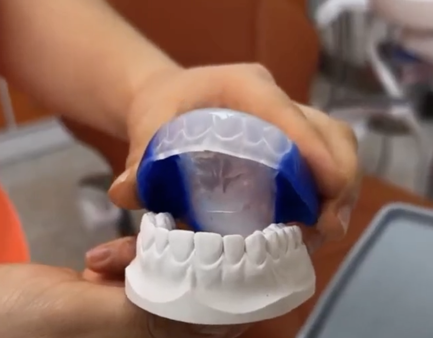 Se trata de una férula de resina transparente y rígida personalizada, la cual puede ajustarse en la parte superior o inferior de tus dientes.